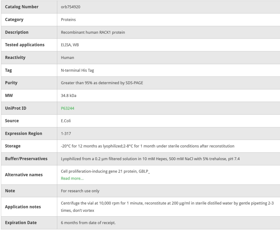 文中关键实验使用Biorbyt orb754920重组人RACK1蛋白进行靶点验证,