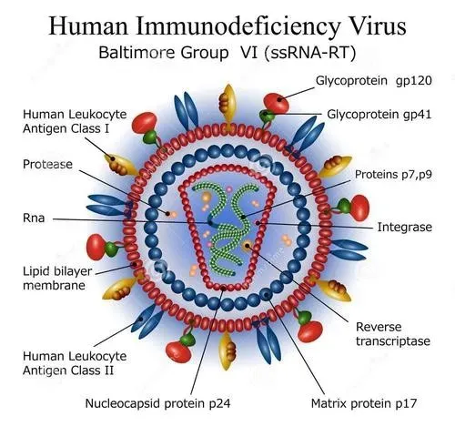 HIV 属于逆转录病毒家族,具有复杂的基因组和衣壳核心颗粒。逆转录病毒是单股正链 RNA 病毒,可以逆转录其基因组,将其插入宿主细胞。通过逆转录,单链病毒 RNA 转化为双链 DNA,双链 DNA 可以掺入宿主细胞的 DNA 中并进行复制。